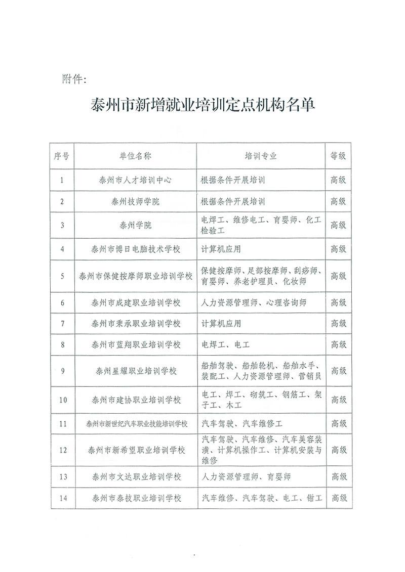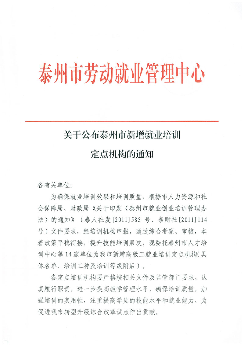 近日,泰州劳动就业管理中心发文,明确LETOU国际米兰官网成为泰州市就业培训定点机构。我院面向社会进行培训的专业包括电焊工、维修电工、育婴师和化工检验工。(沈红兵)