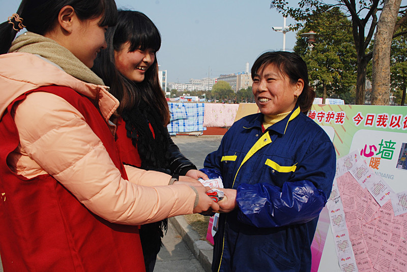 12月19日中午,现场活动阶段,在志愿者的热情号召下,许多同学都积极参与了活动,3000份倡议、2000张“爱宿舍•I承诺”卡以及1000张“心暖认领卡”在半小时内全部发放完毕。有的同学虽然背着书包,提着水壶,但他们仍然愿意停下匆忙的步伐,和志愿者了解此次活动,不仅签下了承诺,答应以后配合校工工作,服从管理,而且还认真地写出了自己的空闲时间表,表示愿意在自己的空余时间里,陪校工叔叔、阿姨聊天,帮忙打扫卫生;更有同学主动要求要在便利贴上写着自己想对校工说的话,他们有的写着感谢校工的话,有的写着对校工的浓浓祝福。志愿者将学生写的便利贴贴到了“我想对您说......”专栏,温馨的祝福围成了一个大大的爱心。很多校工也来到活动现场,亲手写下了对学生的祝福与希望,有的校工不识字,志愿者就一条条地将学生写在的祝福读给他们听,当看到温馨的活动场景,他们们不停地点头微笑,并且一遍又一遍的重复着谢谢,志愿者们不时拍下他们灿烂的微笑,让微笑定格于举手投足间。活动最后,志愿者还向校工赠送了防水手套和口罩。