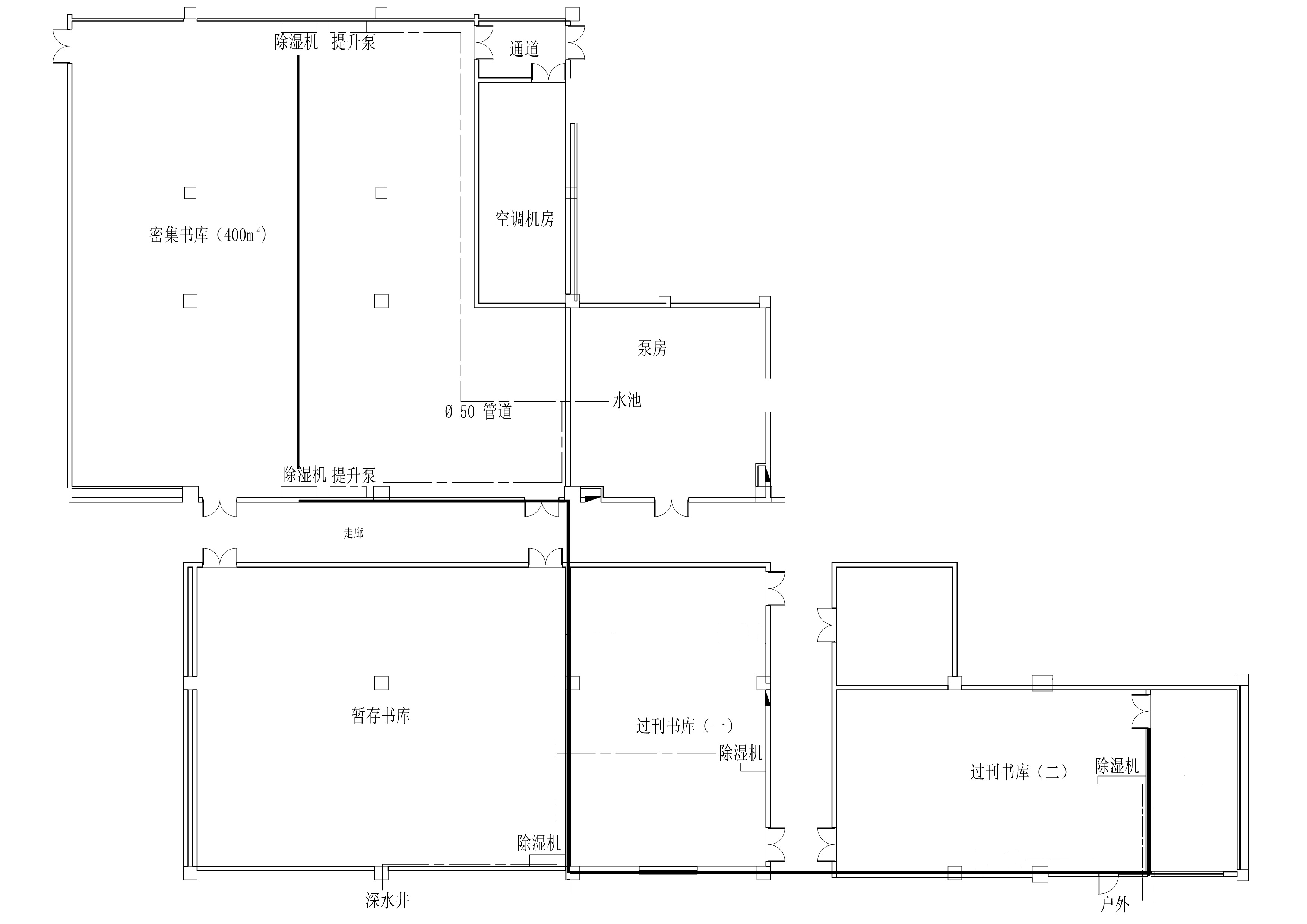 3. 改造密集书库和南侧书库的插座电路,以适用于大功率工业除湿机的使用。将5台大功率工业除湿机放于暂存书库和密集书库的两侧,铺设排水管道将除湿后的冷凝水由管道排到污水提升泵,经提升泵将水提升到上方的管道排到集水池,从而起到书库连续排水的作用。