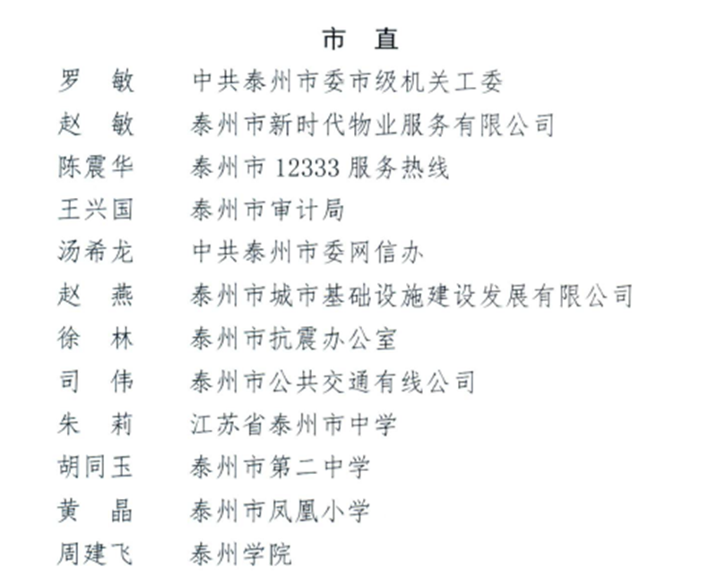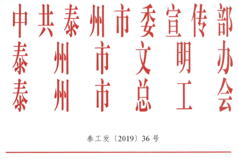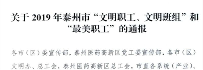 2018年以来,泰州市各地深入贯彻习近平新时代中国特色社会主义思想和党的十九大精神,全面落实市委市政府各项目标部署,组织广大职工积极投身经济建设主战场,积极参与群众性精神文明创建,为推动泰州高水平全面建成小康社会、打造江苏高质量发展中部支点城市作出了积极贡献。在此过程中,涌现出一大批文明创建先进典型。经基层推荐、群众投票和专家评审等程序,泰州市市委宣传部、市文明办、市总工会决定:授予侯娟等81名同志2019年泰州市“文明职工”称号;授予仇建国等10名同志2019年泰州市“最美职工”称号,并授予泰州市五一劳动奖章;授予靖江弘宇公共交通客运有限公司公交227路线等80个班组2019年泰州市“文明班组”称号。
