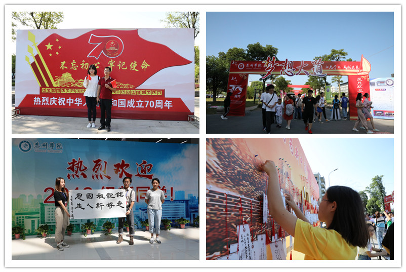 新同学一进校就感受到学校庆祝新中国成立70周年的浓烈氛围,爱国主义教育从进校的第一天就已经开始。鲜艳的国旗悬挂在校园主大道两侧,习近平总书记对新时代中国青年的六点要求标语位列道路上方。学工处在宿舍前道路上布置了梦想大道,用优秀学长事迹激励新同学;团委在校门、报到点、宿舍楼等地点组织了校园打卡活动,新同学纷纷在“起点站”“五星红旗站”“梦想大道”等打卡点拍照留念。