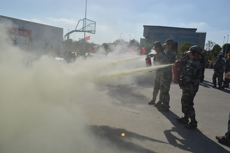2019级二十多名新生代表和高教园区宿管员按照灭火的规范步骤和方法,使用灭火器进行灭火。