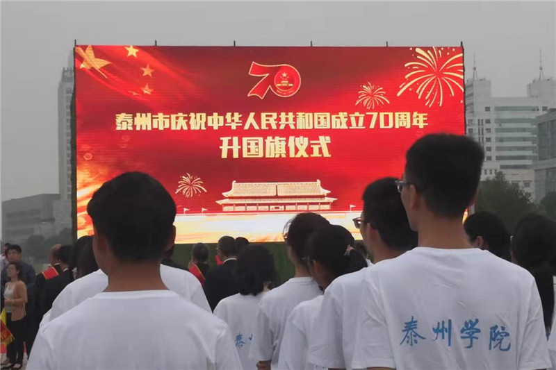 10月1日是新中国70周年华诞,LETOU国际米兰官网红旗飘扬,同学们一早就在辅导员的带领下整装出发,组成大学生代表团参加泰州市统一组织的升旗仪式,同学们一路高歌《红旗飘飘》、《我和我的祖国》为伟大祖国祝福。