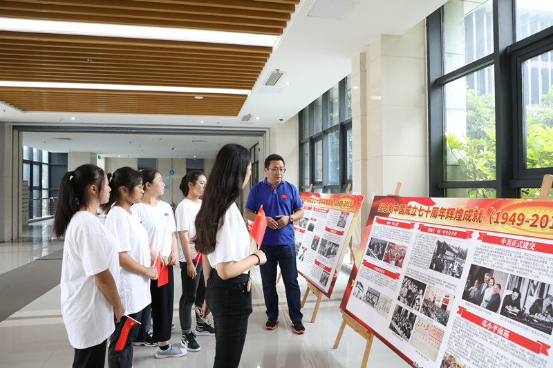 集中收看结束后,同学们还在领导老师带领下观看了新中国70周年图片展,共话70年的辉煌成就,共叙美好未来。经济与管理学院党总支书记张朝明给同学们重点讲解了1978年,那是同学们的父母出生的年代,从那时起,中国开启了改革开放的伟大征程;讲解了2000年,那是同学们自己出生的年代,新世纪创造新辉煌;讲解了党的十八大以来新时代中国特色社会主义的新征程、新使命。