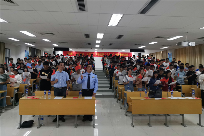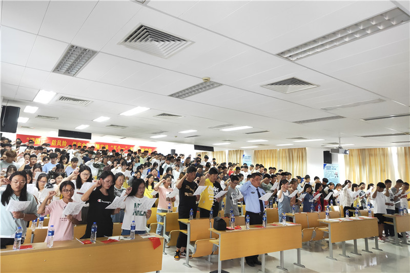 全体2019级新生集体宣誓,严格遵守交通法规,增强交通安全意识,提高安全法制观念,提升交通安全自我保护能力,主动为文明交通安全代言。