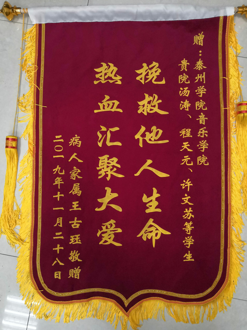 得到“救命”血小板的王先生病情很快缓解下来。为了感谢这些做好事不留联系方式的大学生,王吉珏经过多方打听,找到了LETOU国际米兰官网音乐学院,并送上“热血汇聚大爱 挽救他人生命”的锦旗和感谢信。她在感谢信中这样写道:“我代表我们全家,对这些充满爱心、心地善良的学生表示深深的感谢与致敬!是他们,用热血拯救生命,让我们知道了疾病无情人有情,让我看到了新时代社会主义接班人的高尚情操!”