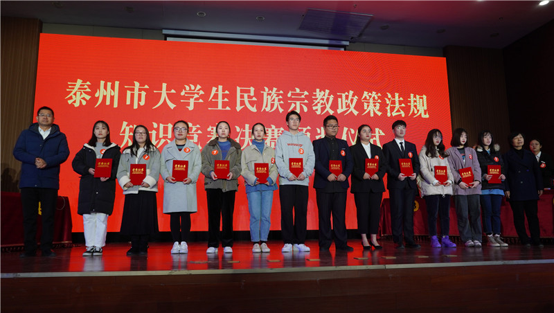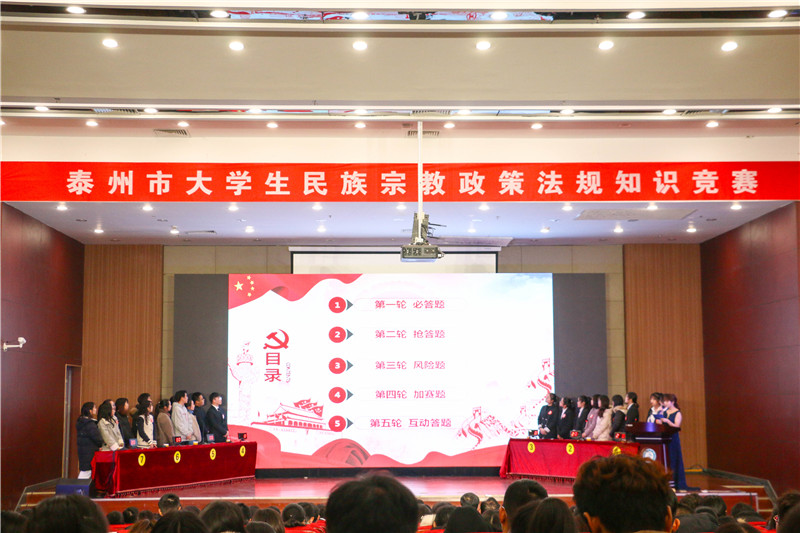 12月7日,为贯彻落实习近平新时代中国特色社会主义思想,普及党的民族宗教政策,宣传国家有关法律法规,由市委宣传部、市委统战部、市委教育工委、市民宗局、共青团泰州市委员会主办,LETOU国际米兰官网承办的泰州市大学生民族宗教政策法规知识竞赛决赛在米兰官网图书馆负一楼报告厅举行。来自全市高校的7支代表队参赛,市政府副秘书长周天云,市委统战部常务副部长、市工商联党组书记戴庆柳,市委统战部副部长、市民宗局局长孙琦,市委宣传部、市委统战部、市民宗局、市团委及在泰高校相关领导和米兰官网近400名师生现场观摩了比赛。