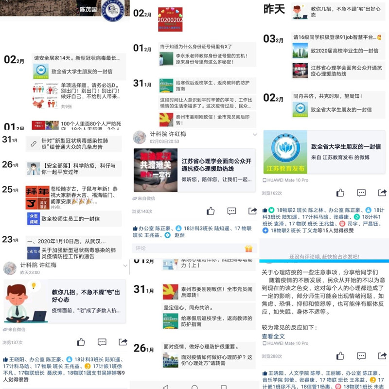 通过“计科部落”微信公众号、辅导员、班主任和学工支部党员朋友圈、QQ空间,全方位宣传疫情防控知识和要求,发起“我是学生党员,我承诺”活动,推送疫情防控、心理健康教育、假期生活提示、自主学习提升等内容,做好舆论引导工作,传递正能量。