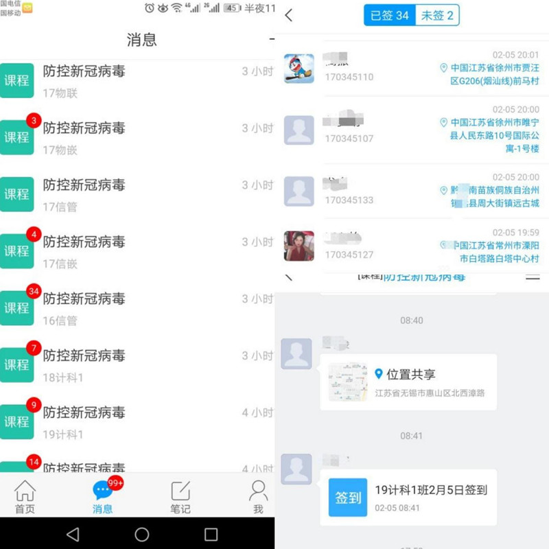 此次疫情防控要求每位同学居家自主隔离14天,但辅导员、班主任老师们无法掌控每个同学的实际位置。计科院为此利用了超星学习通的位置签到功能,在超星学习通开设了“防控新冠病毒”课程,全院所有学生以班级为单位加入该课程,所有辅导员和班主任作为教学团队成员,所有班长设为助教,每天各班级发起一次位置签到,可以精准显示每位同学所在位置,并将其与家庭地址进行比对,从而了解每位同学是否确实执行了居家隔离这一要求。签到数据在系统可以长期保存,并可导出为Excel文件存档。通过这一手段,每天学生签到结束后,计科院仅需不到1个多小时即可完成1074名学生的居家隔离情况的检查。该平台还可以及时面向所有学生发布最新通知和最新防控文件资料。