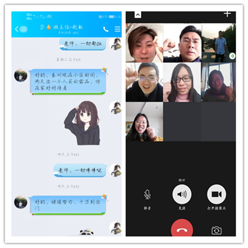 “今天我参加了一个特别的视频会议,有我们学院仲宁老师(副书记)、马永明老师(副院长)、徐慧老师(辅导员)、赵敏老师(辅导员)和王强老师(心理学专业老师)还有我。老师们问了我家庭的情况,学习生活情况,还介绍了学校抗击疫情的情况,感受这么多老师的温暖,我特别开心,希望早点战胜疫情,早回学校。”