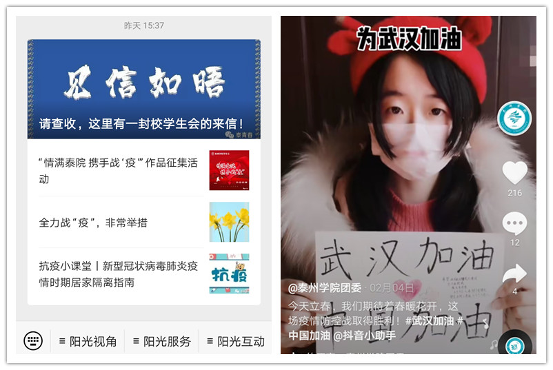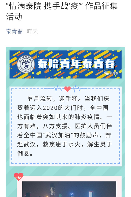3.创新形式,加油助力。校团委鼓励广大团员和团组织为战“疫”前线加油助力。在做好自身防护的前提下,引导不同专业的师生发挥各自特长和学科优势,立足家庭和社区,做好防护宣传、服务保障等工作,示范带动广大群众提升防疫能力。组织心理学专业师生,依托微信、QQ等软件开展志愿服务,为身处疫情防控重点地区的师生送去关爱,帮助公众进行心理疏导,稳定情绪。策划组织“情满泰院 携手战‘疫’”作品征集活动,鼓励学生进行手抄报、文学作品、音乐视频、书画等的创作,充实学生疫期精神文化生活,助力疫情防控。