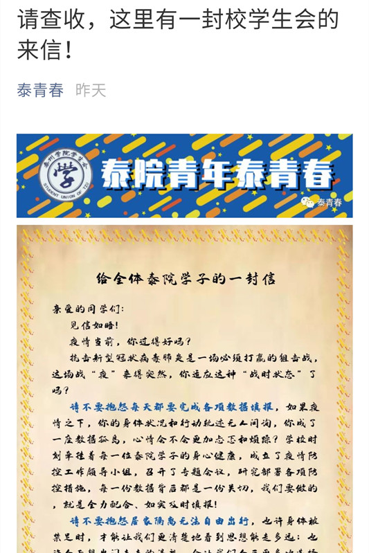 1.听从号令,阳光引领。面对疫情防控严峻形势,校团委高度重视,按照学校党委统一部署,协同开展排查摸底工作,落实各项防控举措。要求广大团员、团干部切实把思想和行动统一到习近平总书记重要指示精神和党中央决策部署上来,把打赢疫情防控阻击战作为检验共青团初心使命的重大实践。积极发出倡议,在学校多媒体平台上发布《给泰院学子的一封信》,鼓励学生以阳光积极的姿态投身到战“疫”各项行动之中,好好听话、传话、发话,珍惜时光,自我成长,贡献力量。