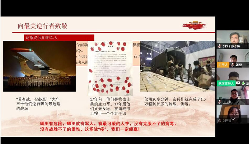 本次团日活动围绕“青春战‘疫’,‘疫’往情深”主题开展,共分“致敬最美逆行者”和“青春宅战‘疫’两个环节”。祖海老师全新演绎的这首抗疫版《为了谁》唱出了每一位中华儿女的心声;团支书微团课《致敬最美逆行者》带我们走进白衣天使、火神山、雷神山建设者、人民军队、志愿者及医疗废物处理人员,再一次感受他们最美的瞬间;团支部“家里蹲”战疫视频展现了团支部全体团员居家学习,宅家抗疫的青春画面;班长宣读抗“疫”倡议书,进一步明确团员的青春使命与担当,全体团员一致表示在疫情面前相信武汉、相信中国,不信谣不传谣,坚决服从学校安排。