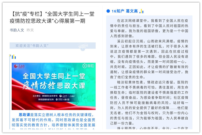 班级团支部组织每位同学撰写了听课心得体会,并在学院官微“书韵人文”平台进行了系列推送。16级知识产权葛文高在体会中写道:“回首向来萧瑟处,也无风雨也无晴。疫情正在逐步散去,生活即将回到正轨。通过听课,我明白我需要的不是一时因为疫情而生起的热血与激情,而是应该铭记祖国为人民付出的努力,懂得感恩,一步一个脚印的认真学习,努力做一个有责任有担当的中国青年。”