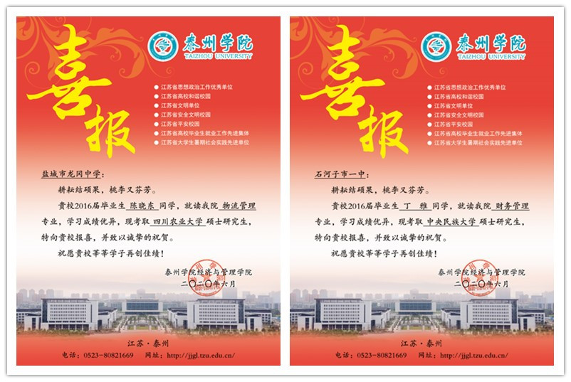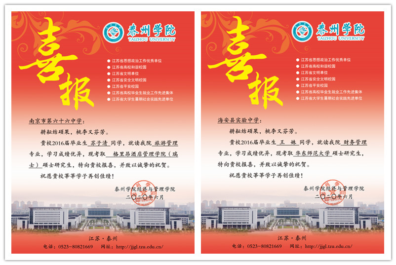 为扩大学院办学成效的影响力,学院制作了精美喜报,寄送至学院生源较集中的学校新疆石河子市一中、海安县实验中学、盐城市龙岗中学、南京市六十六中学等生源学校,为即将开始的高考招生做好准备,鼓励更多优秀学子报考米兰官网。(经管学院)