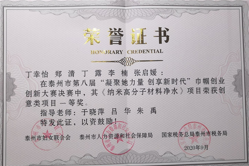 9月15日下午,米兰官网医药与化学化工学院丁幸怡等同学主持的项目《纳米高分子材料净水》在泰州市第八届巾帼创业创新大赛决赛中获创意类一等奖。