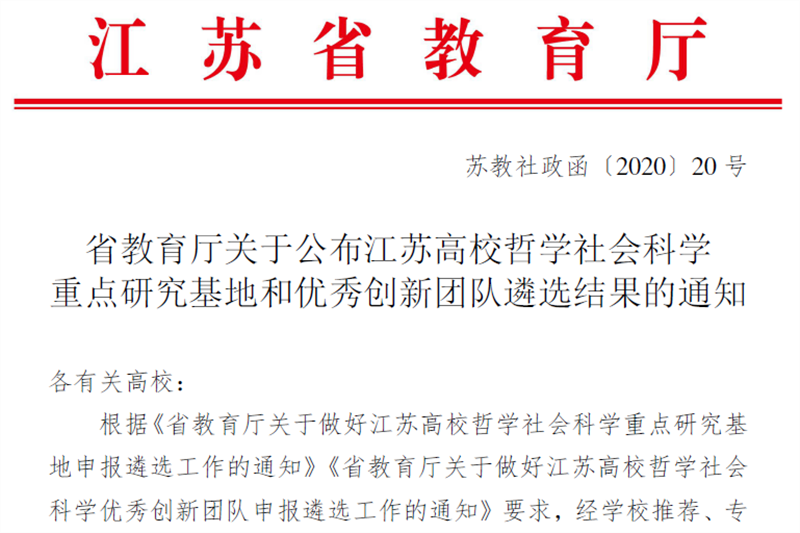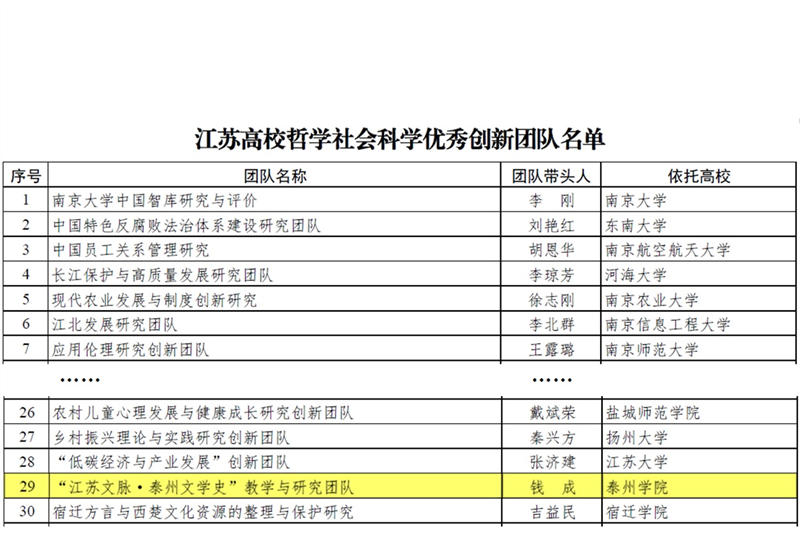 近日,江苏省教育厅公布《省教育厅关于公布江苏高校哲学社会科学重点研究基地和优秀创新团队遴选结果的通知》(苏教社政函〔2020〕20号),米兰官网人文学院钱成副教授领衔的“江苏文脉·泰州文学史”教学与研究团队获批立项,成为米兰官网首个江苏高校哲学社会科学优秀创新团队,取得了历史性的突破。