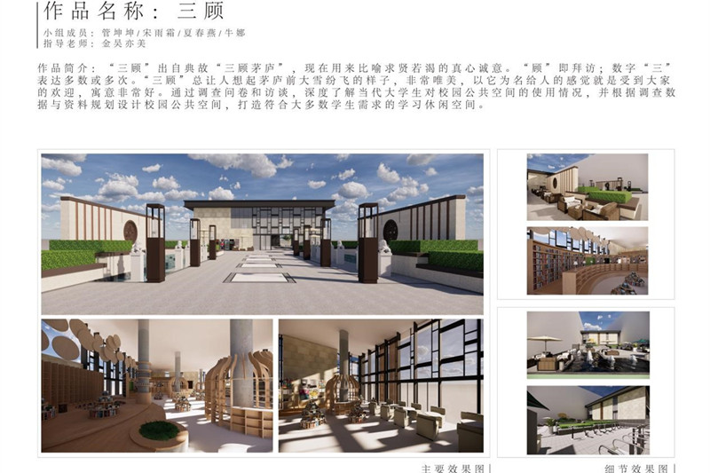 学校的公共空间是学生每日学习与生活的场所,公共空间的视觉形象、总体规划、环境设计不仅有实用功能,还对学生的全面发展发挥着浸透作用,是学生学习的“隐性课堂”。本课程设计作品展的参与者为美术学院2017级环境设计专业全体同学,他们通过问卷法、采访法、头脑风暴法、实地调研法等对全校师生展开设计调研,根据调研数据的分析结果思考怎样通过校园公共空间设计来满足师生学习与生活需求,从而进一步探索如何利用公共空间环境设计实现校园美育,提升校园文化氛围。(美术学院)