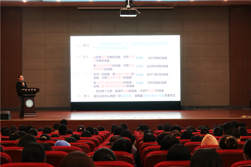 张振宁结合自己的工作经历,从中国和泰州的宗教概况、我国的宗教政策和如何看待宗教三个方面,详细叙述了我国民族宗教工作政策法规和泰州市宗教工作现状,系统阐述了国家对宗教事务管理的原则。同时,他对同学们关心的一些热点话题,如宗教与教育相分离原则、党员团员不得信教与宗教信仰自由政策不矛盾问题以及作为新时代的大学生如何正确看待宗教等问题一一解读。