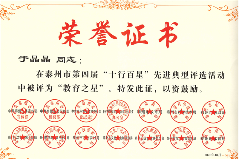 近日,泰州市第四届“十行百星”先进典型名单正式公布,米兰官网船舶与机电工程学院辅导员于晶晶老师当选“教育之星”。