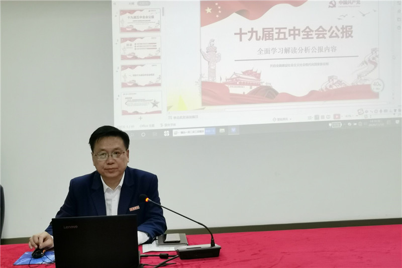 陈克宏介绍了党的十九届五中全会概况,从“决胜全面建成小康社会取得的决定性成就、我国发展环境面临的深刻复杂变化、到二〇三五年要实现的远景目标、‘十四五’时期经济社会发展的主要目标、实现奋斗目标的具体举措”等方面,对党的十九届五中全会精神进行了重点解读。