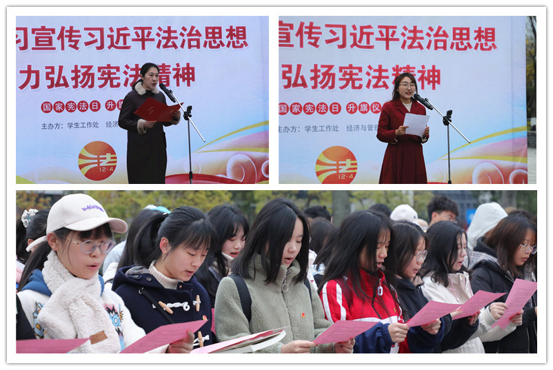 “宪法晨读”活动中,经济与管理学院党总支副书记邓淑梅带领现场师生诵读宪法章节、学习宪法知识,让师生切实感受宪法的尊严和魅力。学生代表王怡萱进行“青年自强,与法同行”的发言,号召同学们珍惜当下的学习时光,好好学习宪法精神。
