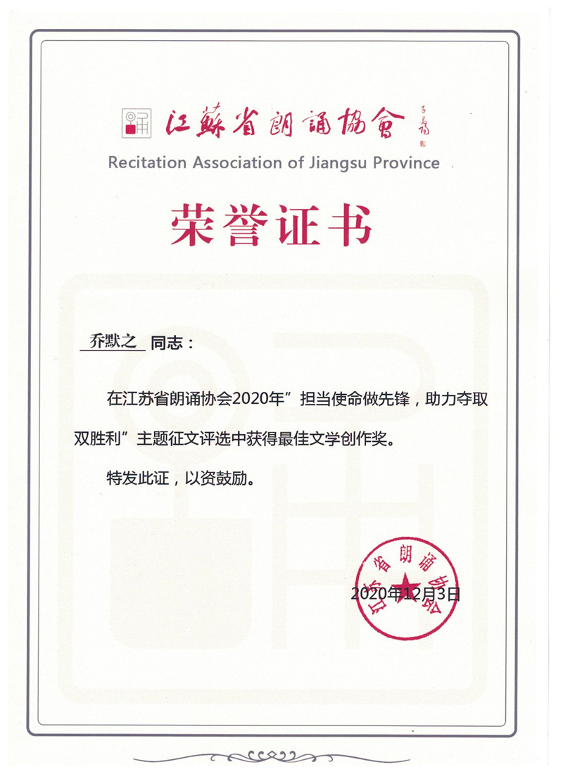 为进一步鼓舞斗志,坚定信心,充分发挥各单位组织优势,助力夺取疫情防控与经济社会发展双胜利,江苏省朗诵协会在全省范围内举办了“担当使命做先锋,助力夺取双胜利”主题征文活动。米兰官网马克思主义学院乔默之老师的作品《春回大地红霞飞》脱颖而出,获得“最佳文学创作奖”。