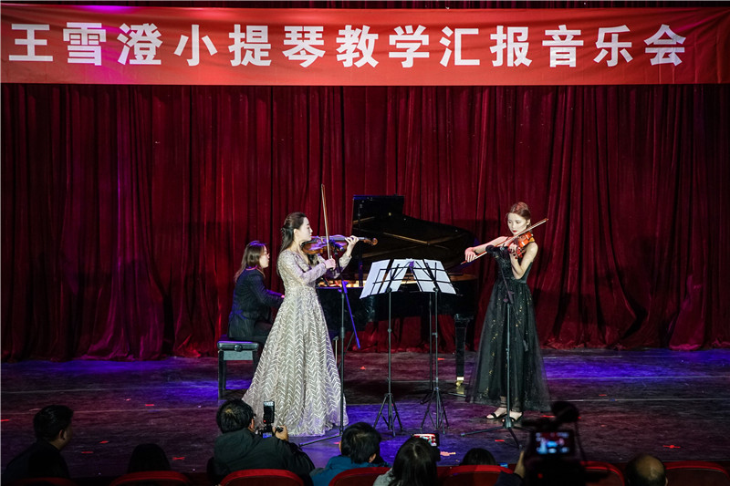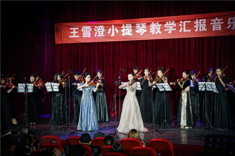 音乐会在小提琴齐奏《我的祖国》琴声中拉开帷幕。来自各个年级小提琴零基础的学生为大家带来了《花儿与少年》、莫扎特《第四协奏曲》、《渔舟唱晚》、《乘着歌声的翅膀》、《瑶族舞曲》、《绒花》、肖斯塔科维奇二重奏等中外经典名曲。王雪澄与学生一起演奏了巴赫《d小调双小提琴协奏曲》。回望自己成长的路,激动的她向领导、老师、同学、家人和幕后工作人员表达了自己的谢意。沈琤教授受邀与王雪澄共同领衔小提琴合奏《山丹丹花开红艳艳》将音乐会的气氛推向高潮。