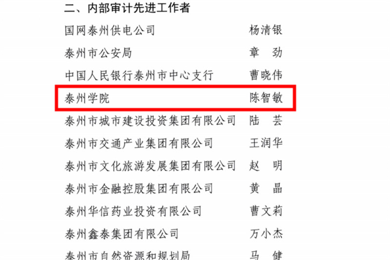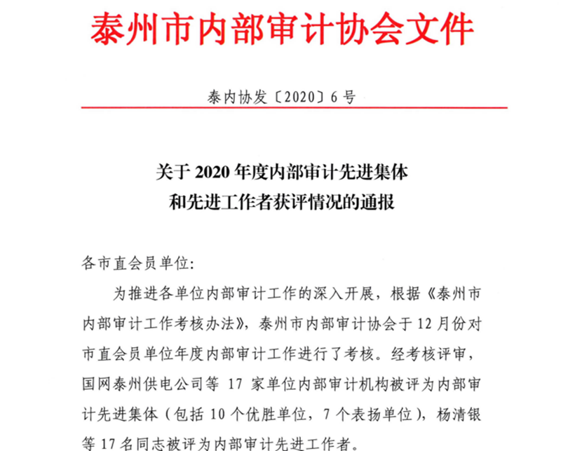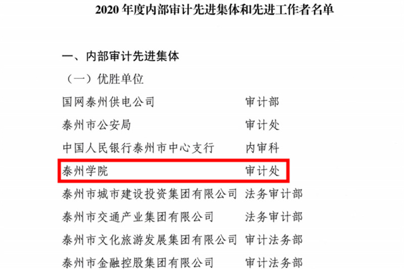 2020年12月,泰州市内部审计协会根据《泰州市内部审计工作考核办法》,从内部审计机构设置、队伍建设、制度建设、项目实施及整改情况、理论研讨、信息宣传、内审成效及以审代训等方面对市直会员单位年度内部审计工作进行了全面考核。米兰官网审计处获评2020年度内部审计先进集体,审计处陈智敏获评2020年度内部审计先进工作者。(审计处)