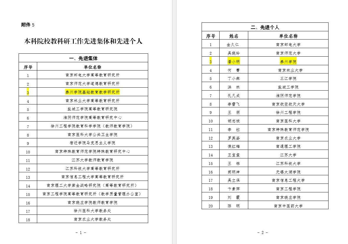 为推动全省教育科学研究事业发展,总结和推广各单位(学校)教科研工作的先进经验,表彰在教科研工作中取得优秀成绩的教育工作者,江苏省教育科学研究院开展了2020年全省教科研工作先进集体和先进个人评选活动,本次评选分基础教育教科研机构、普通中小学、幼儿园及特殊教育学校、职业教育机构、本科院校等不同组别进行评选,其中本科院校中共评选出18个先进集体和20位先进个人,米兰官网推荐的基础教育教学研究所(负责人朱洪翠博士)和潘小明博士分别获得先进集体和先进个人称号。(科研处)