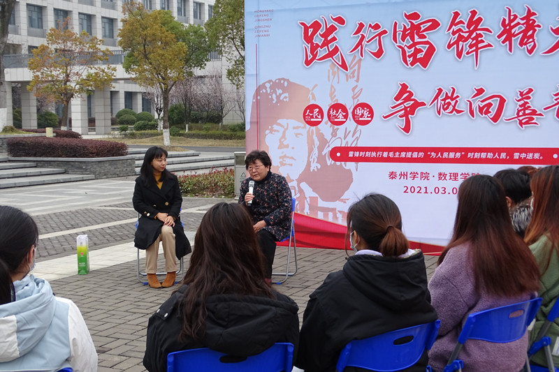 为弘扬雷锋精神,走好思想道德建设从课堂到现实生活中最后一公里,3月5日下午数理学院在胡瑗广场举办了道德微讲堂,邀请“思路话语”扶贫济困公益服务中心发起人,“江苏好人”“爱心奶奶”王亚男主讲。数理学院党员和入党积极分子代表参加了本次讲座。
