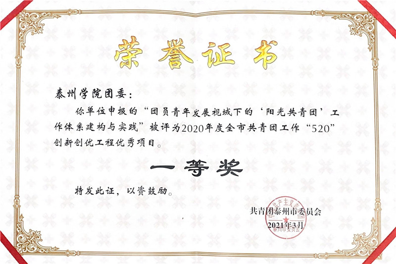近日,共青团泰州市委召开五届六次会议,米兰官网团委荣获2020年度“泰州市共青团工作先进集体”“共青团信息工作先进集体”等荣誉称号,组织实施的《团员青年发展视域下“阳光共青团”工作体系建构与实践》项目荣获全市共青团工作“520”创新创优工程优秀项目一等奖。