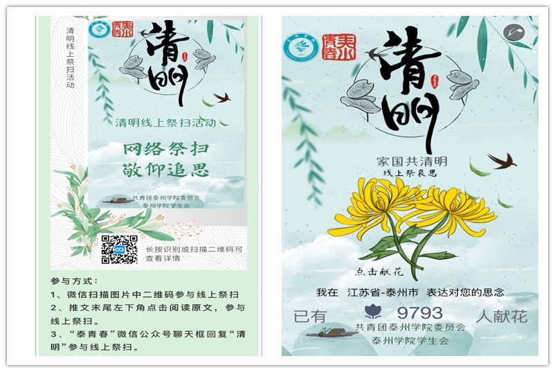清明期间,学校还组织师生参加了中央文明办、中国文明网举办的“缅怀英烈 铭记历史——网上祭英烈”活动,近万名师生在线上向英雄献花。校团委线上发起“祭英烈,铭党史”祭扫活动,动员广大团员青年通过网上献一束花来、发表一段感言等方式,表达对革命先烈的感恩和崇敬之意。