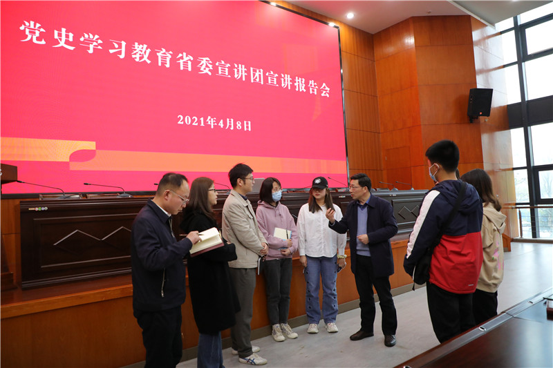 4月8日下午,省委宣讲团成员、淮阴师范学院党委常委、副校长韩同友教授来米兰官网开展党史专题宣讲。校党委书记赵茂程主持宣讲报告会。校党委理论学习中心组成员、中层干部、马克思主义学院教师、辅导员、党支部书记以及师生党员代表参加。