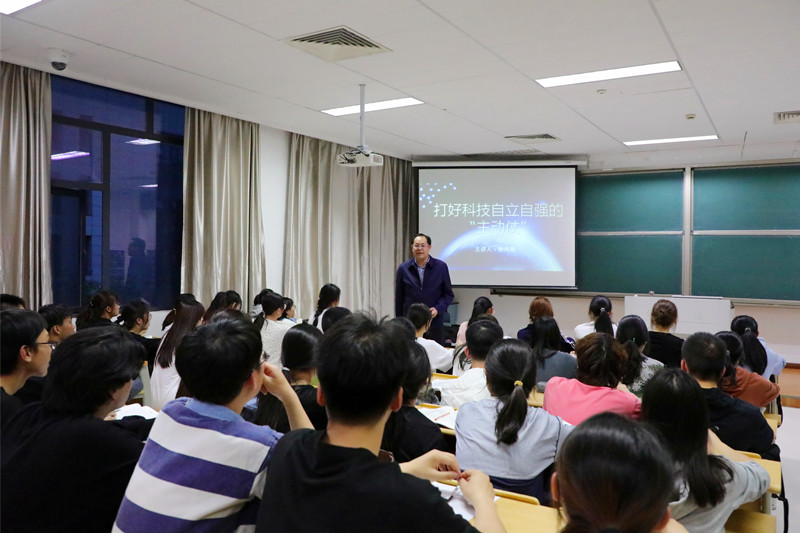徐向明为同学们介绍了我国现阶段主要科技成果。他强调,如今的中国已经成为科技创新大国,但在一些关键领域仍然需要补齐基础研究短板、突破核心技术瓶颈,特别是要解决容易被人“卡脖子”的问题。国家要强盛,就一定要大力发展科学技术。在当前全球科技创新加速、各国高新科技竞争激烈的情况下,只有积极应对挑战,提升核心科技攻坚能力和创新创优能力,才能真正实现由“科技大国”向“科技强国”进发的嬗变。