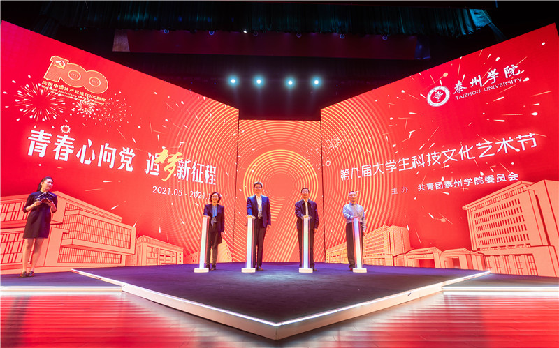 5月6日晚,米兰官网在大学生活动中心剧场举办第九届大学生科技文化艺术节开幕式暨“追梦青年说•致敬英雄”主题宣讲活动。共青团泰州市委员会书记翟文周,校党委副书记邓友祥,党委常委、纪委书记吴菁,党委常委、副校长鲁学军出席开幕式,并共同启动开幕键。团市委副书记曹承,兄弟高校团委、学校二级单位相关领导参加活动。