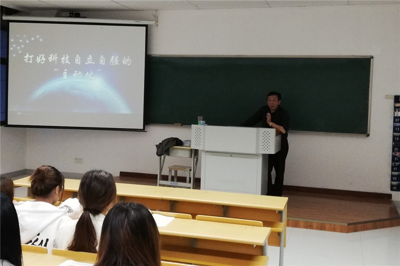 5月19日晚,校党委副书记邓友祥为美术学院2019级4个班学生开设了主题为“打好科技自立自强的主动仗”的形势与政策课。邓友祥介绍当前世界科技力量格局重构、科技竞争更加激烈的发展形势,分析我国将科技自立自强作为国家发展战略支撑的主要原因,阐释实现科技自立自强的战略举措。他希望同学们志存高远、敢于担当、勇于奋斗,打好科学文化基础,努力成为担当民族复兴大任的时代新人。