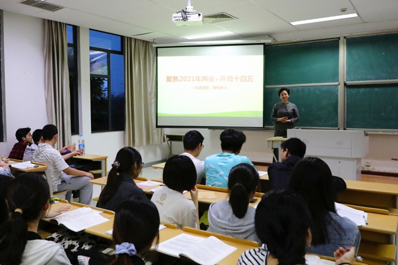 4月20日晚,校党委常委、纪委书记吴菁在3107教室为计算机科学与技术学院20计科专业1班和2班的同学讲授题为“看懂新发展格局这盘大棋”的形势与政策课。