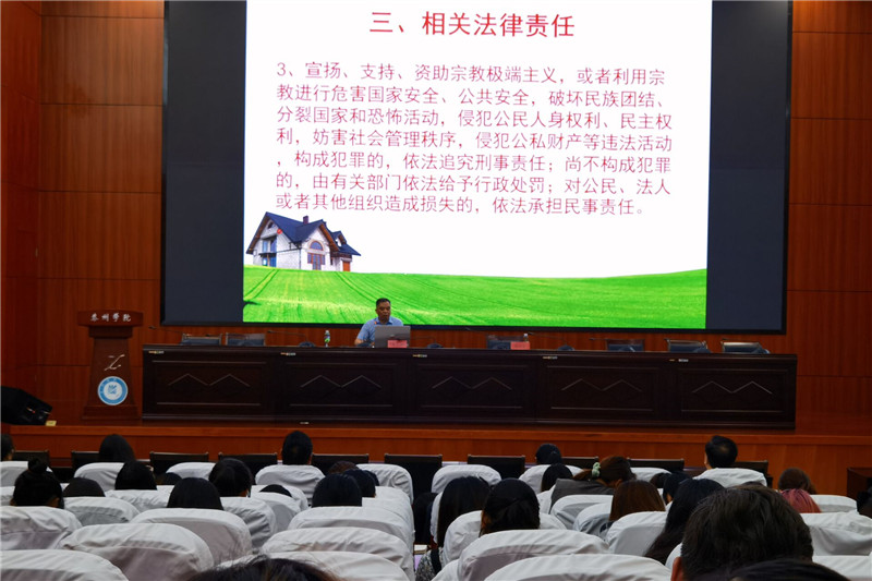 朱太兴结合自己的工作经历,从我国民族宗教基本常识、依法管理民族宗教事务以及相关法律法规三个方面,对我国民族宗教政策法规进行了详细解读,并就学校的民族宗教工作进行了指导。