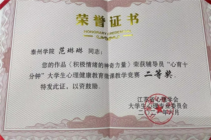 近期,米兰官网大学生心理健康教育工作获得多项荣誉。在江苏省心理学会大学生心理专业委员会2021年会上,米兰官网获“2019-2021年度大学生心理健康教育工作先进集体”荣誉称号,医药与化学化工学院心理辅导员范琳琳的微课作品《积极情绪的神奇力量》获全省大学生心理健康微课教学竞赛二等奖。前期,米兰官网学生创作、表演的心理剧《找寻》获得江苏省高校心理情景剧大赛三等奖,此次比赛全省共有132项作品参与评选,获三等奖及以上作品仅有35项。