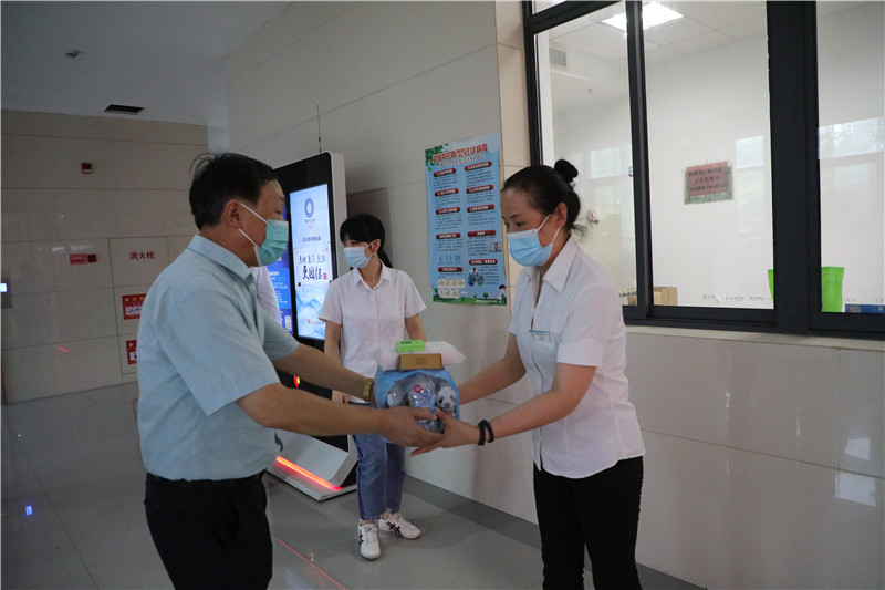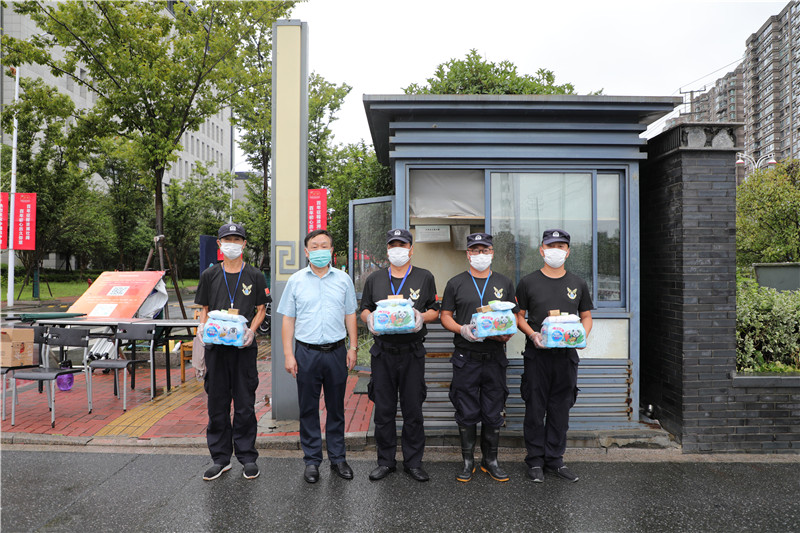 张曙光一行先后来到保安值班岗亭、行政楼值班室、学生公寓、学生食堂和高教后勤服务公司等场所,对安保工作人员及后勤服务在岗员工表示慰问,对他们战高温、防疫情、抗台风所付出的辛勤劳动给予充分肯定和衷心感谢,并代表学校向一线在岗员工赠送防暑降温物品。