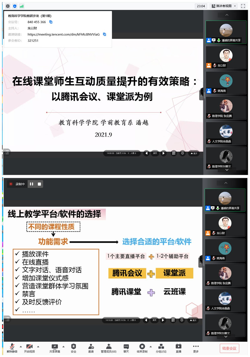 潘越老师以《在线课堂师生互动质量提升的有效策略:以腾讯会议、课堂派为例》为题,从“在线课堂师生互动效果的影响因素”以及“提升在线课堂师生互动质量的有效策略”两个维度展开,围绕线上教学平台选择、互动形式、互动方法、互动内容、教学态度、教学风格等方面,分享了她巧妙借助多元平台、积极探索网络直播模式下师生互动教学模式的经验和体会。她结合《学前教育科研方法》的课程特点,对课堂准备、新知学习、学习巩固、效果呈现等多个环节进行探索实践,构建了从考勤、提问(投票、抢答、随机点名、连麦回答)到直播答疑(串讲)、随堂测试、发布话题的在线教学方法,不仅提高了学生的学习兴趣,而且丰富了在线教学内容,为同类课程的线上教学提供了有益借鉴。