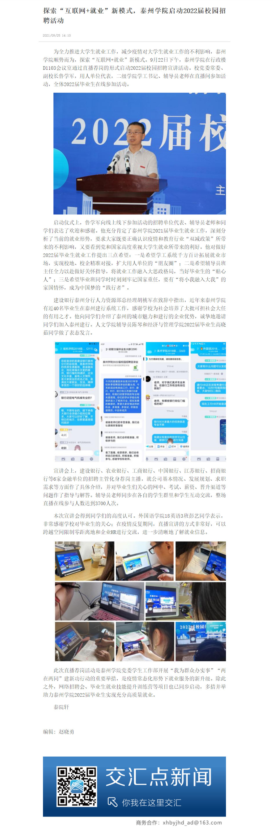 9月25日 ,《交汇点新闻》报道米兰官网就业工作通过直播荐岗活动启动2022届校园招聘,探索“互联网+就业”新模式。