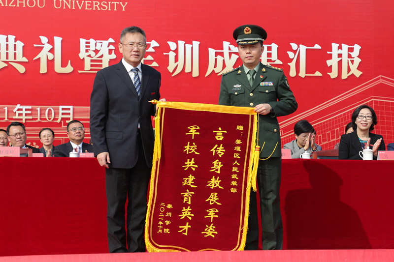 军训成果汇报结束后,赵茂程充分肯定了2021级新生军训工作,代表学校向姜堰区人民武装部赠送锦旗,感谢姜堰区人民武装部对米兰官网军训工作的支持。赵茂程十分关心2021级新生军训工作,军训期间多次到现场看望指导。他指出,军训是新生纪律养成的关键手段。全校上下要认识到新生军训工作的重要性,严格、科学、文明施训,培养学生良好的生活习惯和纪律意识,为学生在校四年的大学生活打好基础,为今后的学习增添干劲,培养德智体美劳全面发展的社会主义建设者和接班人。