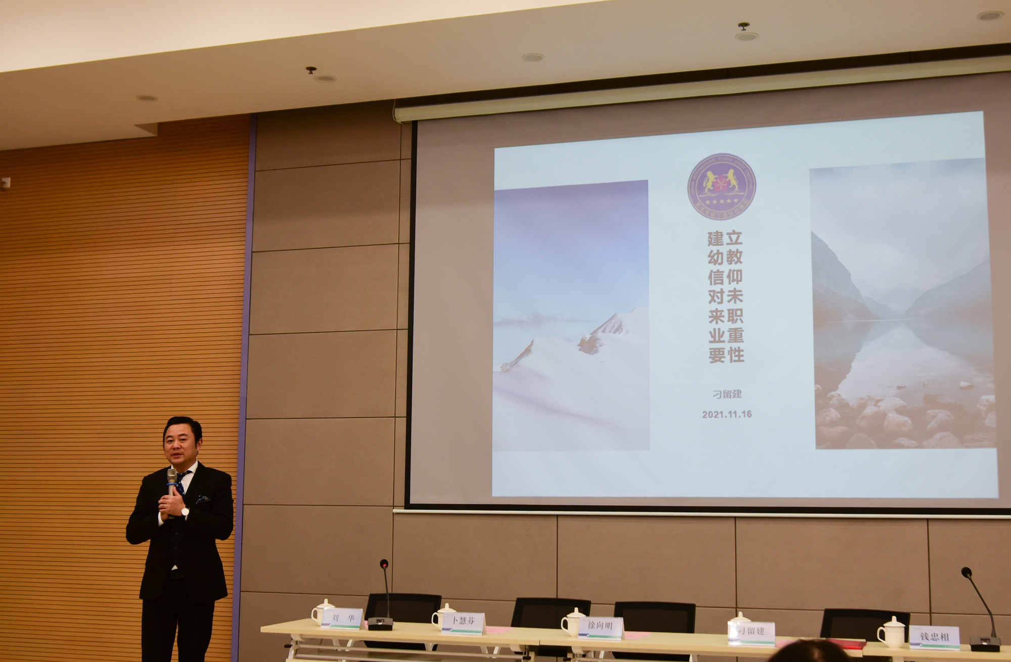 授聘仪式结束后,刁留建以《建立幼教信仰对未来职业的重要性》为题作了专题讲座,就“如何建立信仰”、“无可挑剔的人生蓝图”、“幼教人的精神追求”三个子主题展开分享,并对在座学子提出殷切希望:用真实真诚的情感对待每一个孩子,用爱和温暖贯穿整个职业生涯!