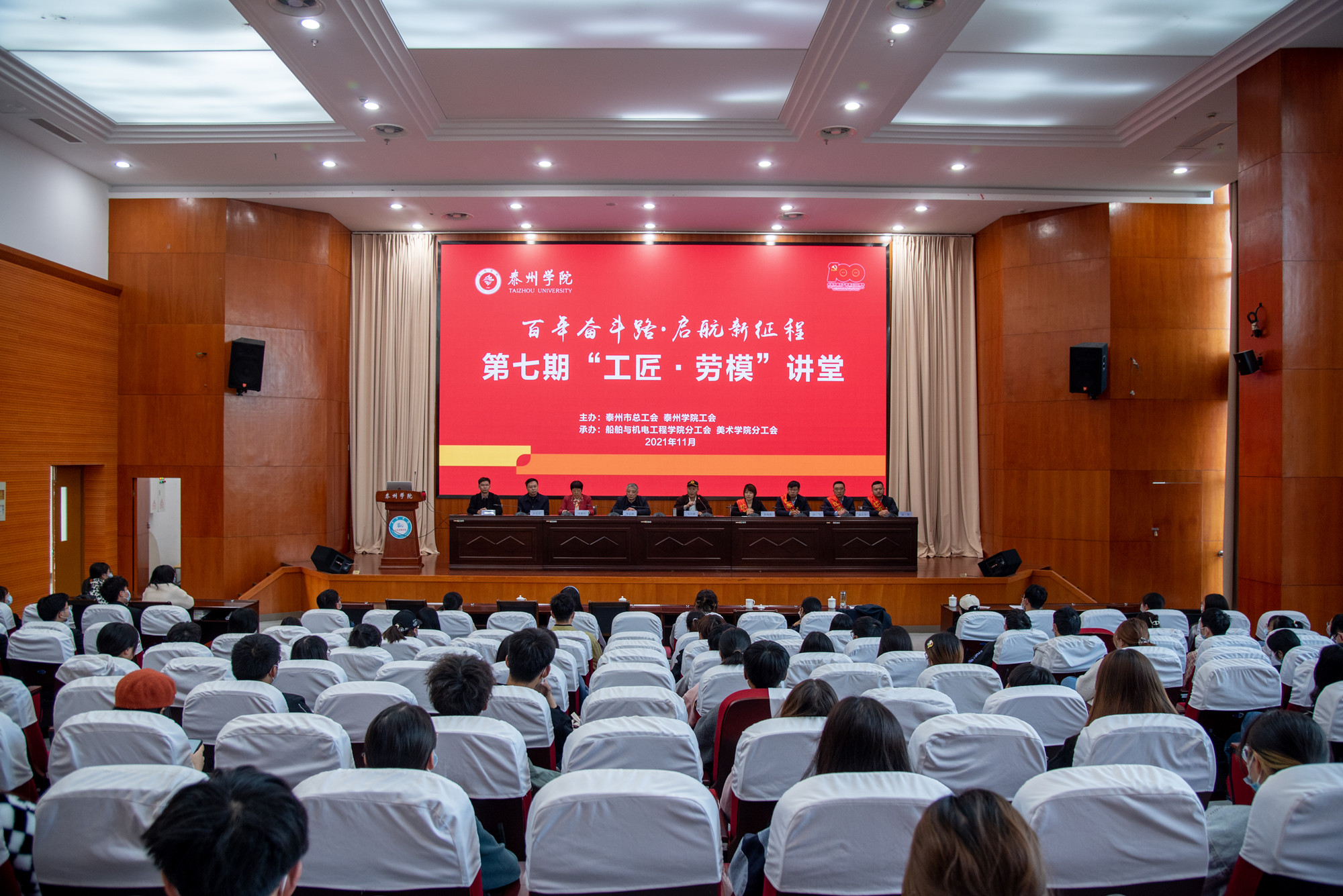 为全面贯彻落实党的十九届六中全会精神,大力加强新时代劳动教育,全面实施校阳光学工“思政引领工程”,11月18日下午,由泰州市总工会和LETOU国际米兰官网工会主办,船舶与机电工程学院和美术学院分工会承办的“百年奋斗路·起航新征程”第七期工匠·劳模讲堂在学校D1216报告厅顺利举办。泰州市总工会原副主席吴江泽、泰州市教育局工会负责人李文林、船舶与机电工程学院、美术学院党总支负责人与近200名学生代表出席宣讲活动。活动由校工会主席刘素红主持。