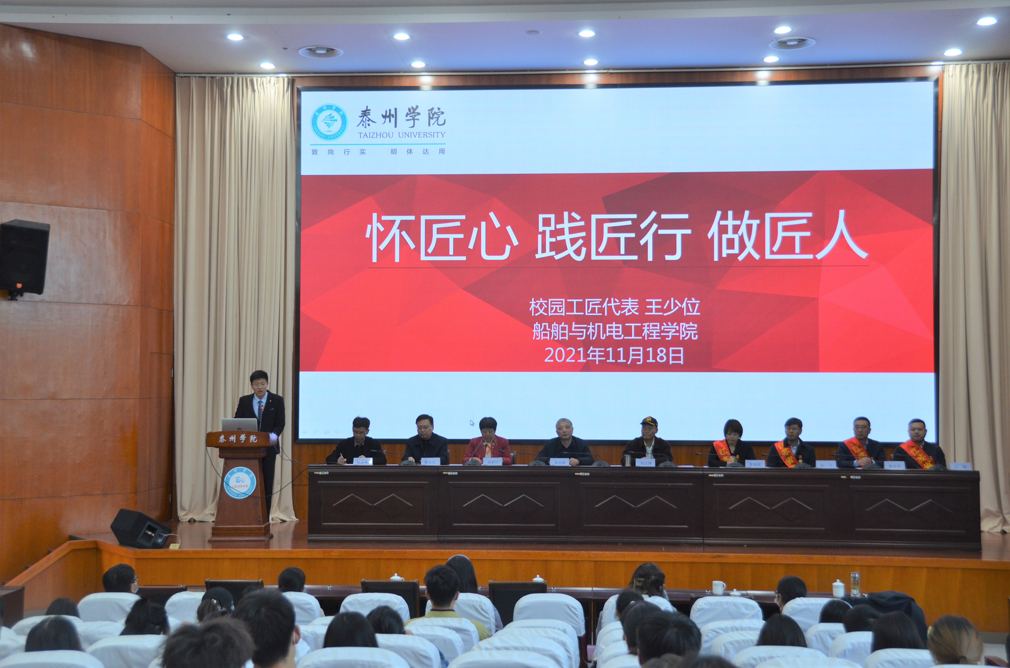 第二届校园工匠代表、船舶与机电工程学院学生会主席王少位从怀匠心、践匠心和做匠人三个方面讲述了他在泰院修炼工匠的生动故事。