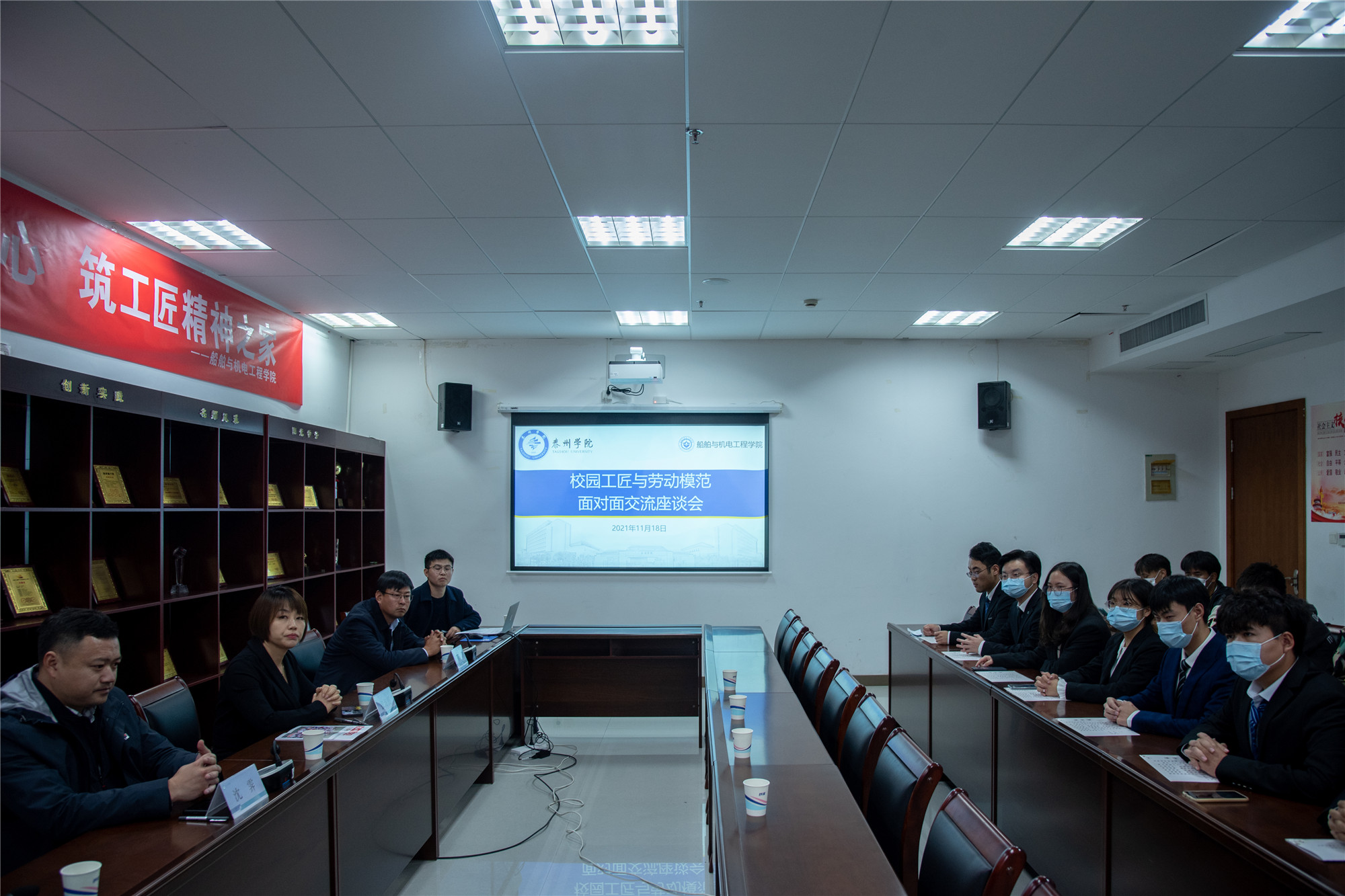 为引导青年学生弘扬工匠、劳模精神,培养高素质应用型人才,11月18日下午,船舶与机电工程学院在D2403会议室举行校园工匠与劳动模范面对面交流座谈会。江苏省劳动模范张海霞、孙飞、沈霁、戴永东,船舶与机电工程学院第二届“校园工匠”10名荣誉获得者及部分学生代表参加活动。
