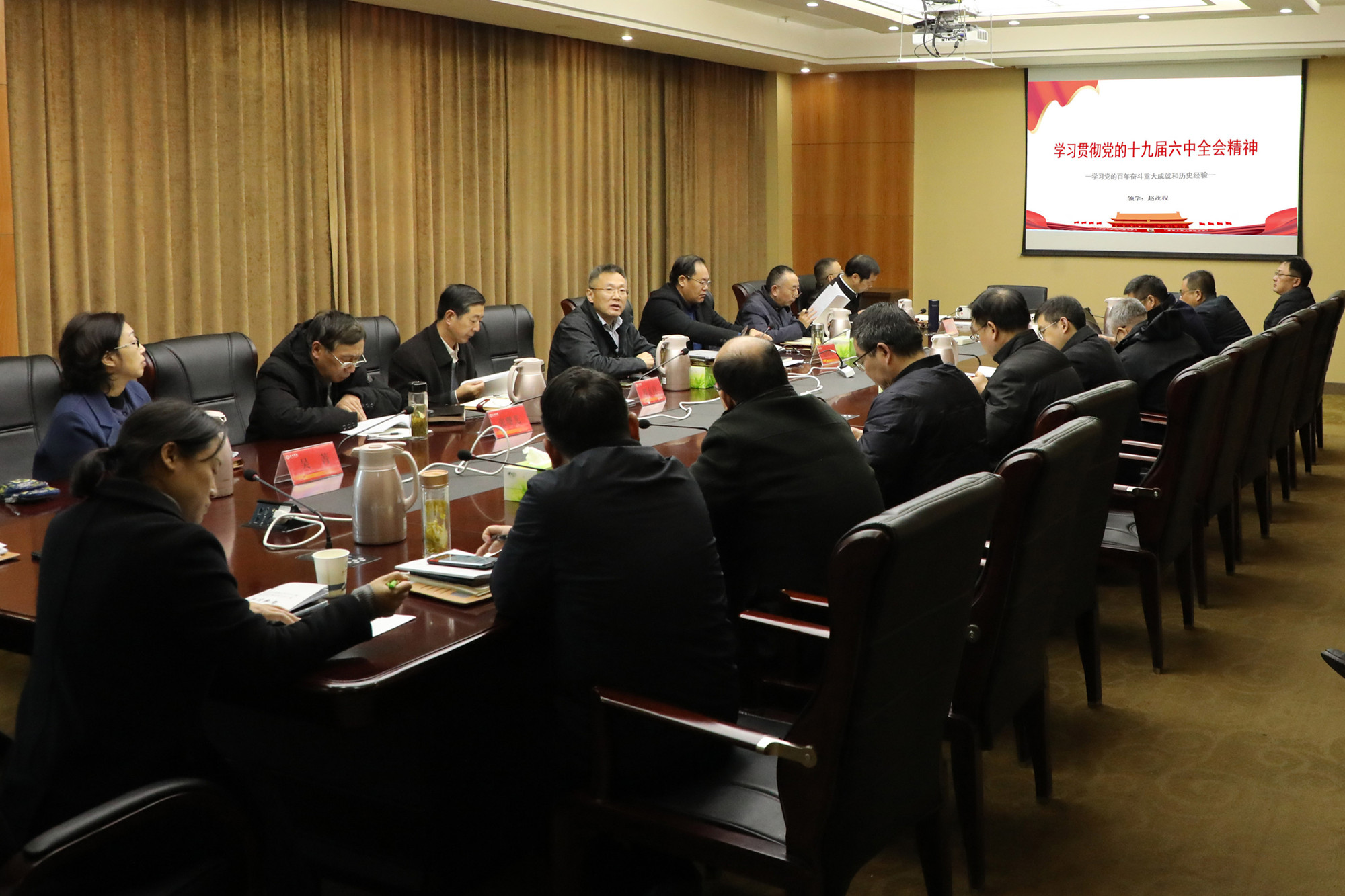11月23日下午,校党委理论学习中心组在办公楼D1605会议室召开集体学习会,专题学习党的十九届六中全会精神。校党委理论学习中心组成员参加了学习会。