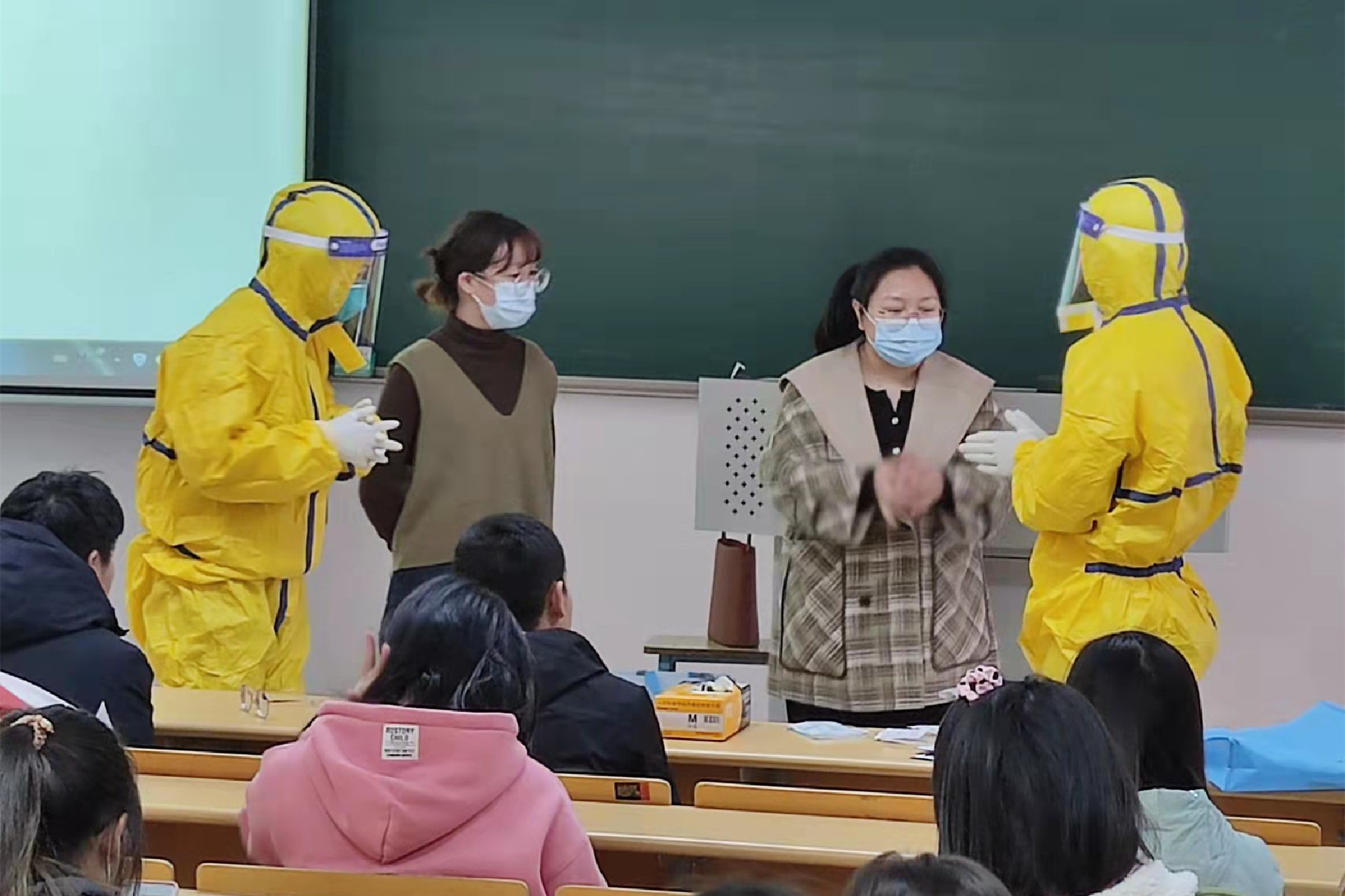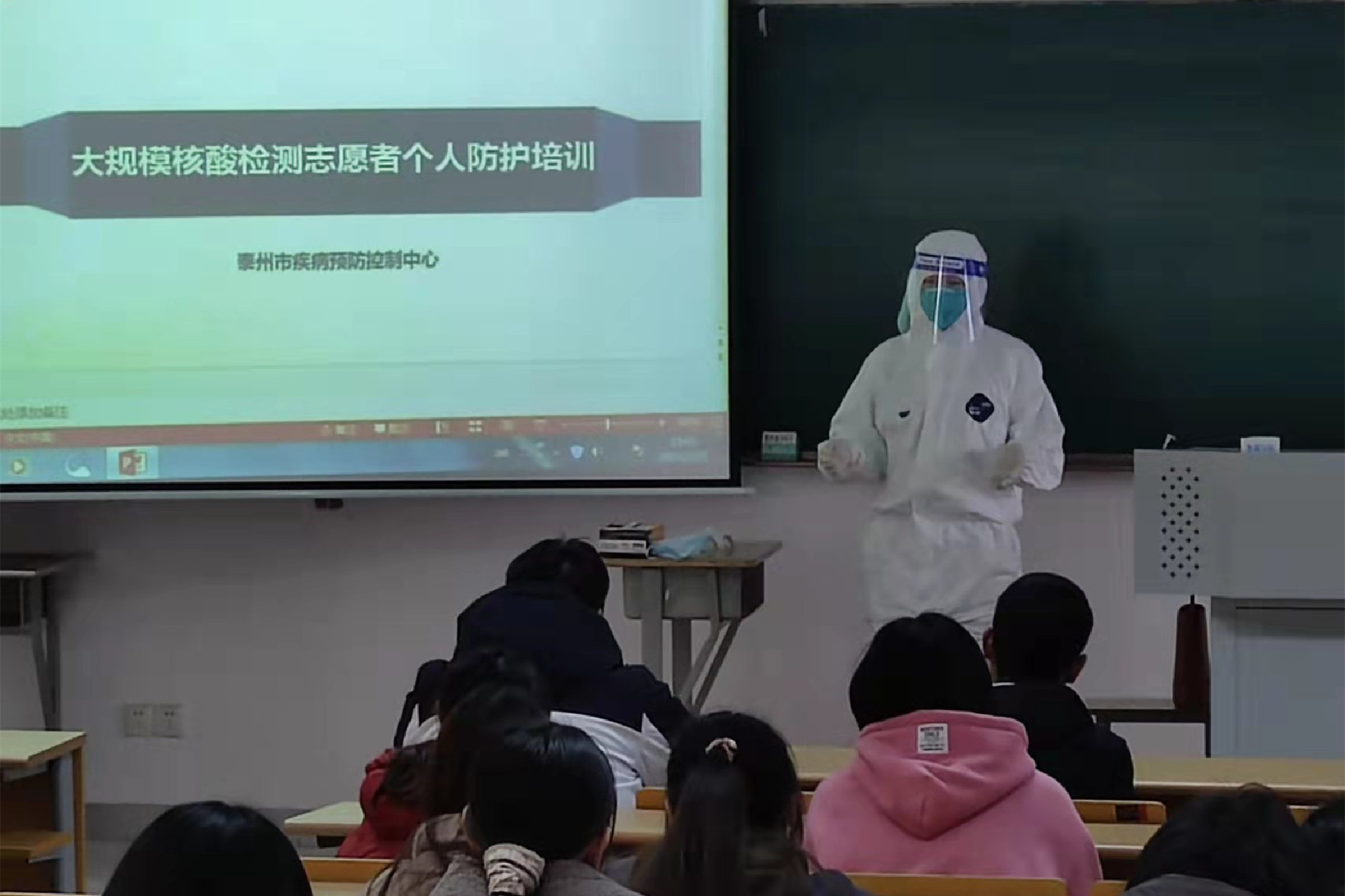 培训包含理论培训、操作演示和实际操作。市疾控中心蒋小丽等工作人员通过PPT文字和视频进行讲解,并让学生进行了现场实际操作演练。在老师的指导下,志愿者顺利完成了二级防护装备的穿、脱演练,并获得了老师的认可。